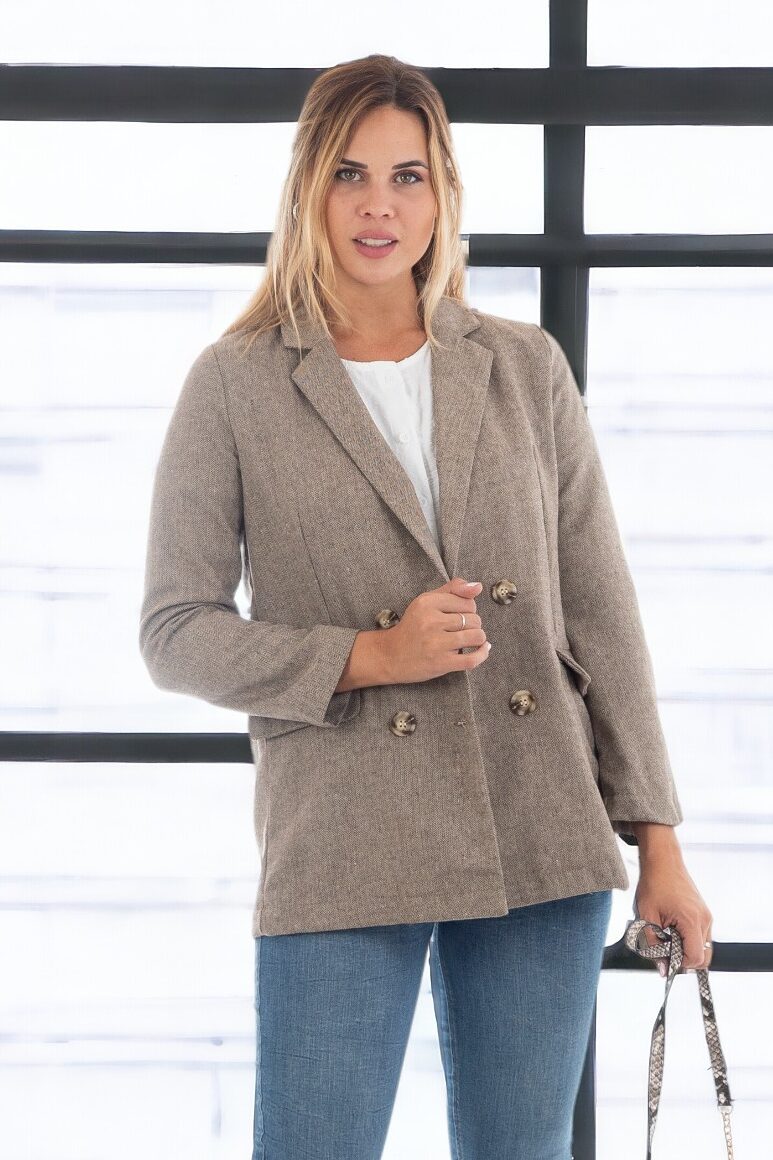 - La americana de espiga marrón para mujer es una prenda versátil que eleva cualquier look, su tejido con patrón de espiga aporta textura y elegancia, mientras que el corte entallado y los botones realzan la silueta y añaden un toque sofisticado.