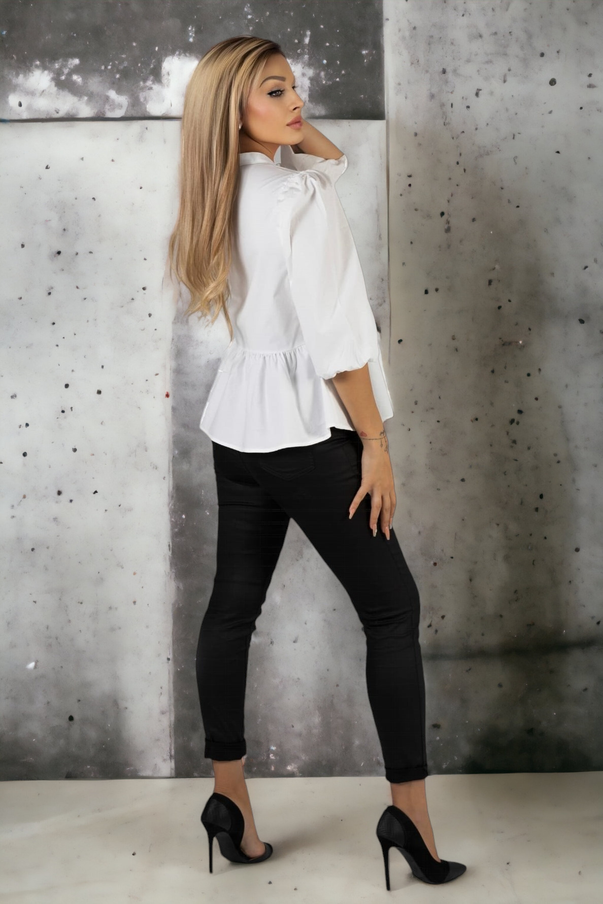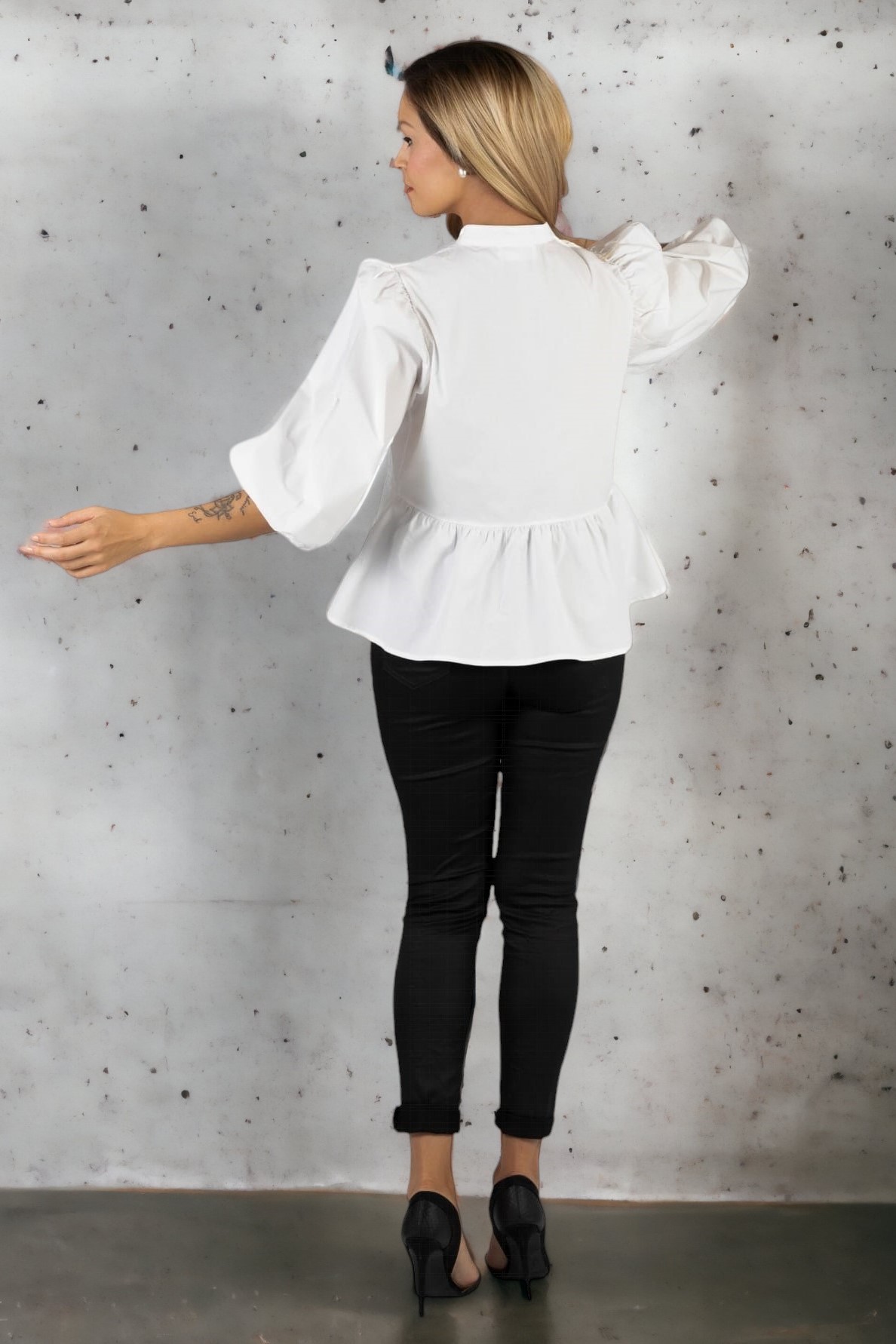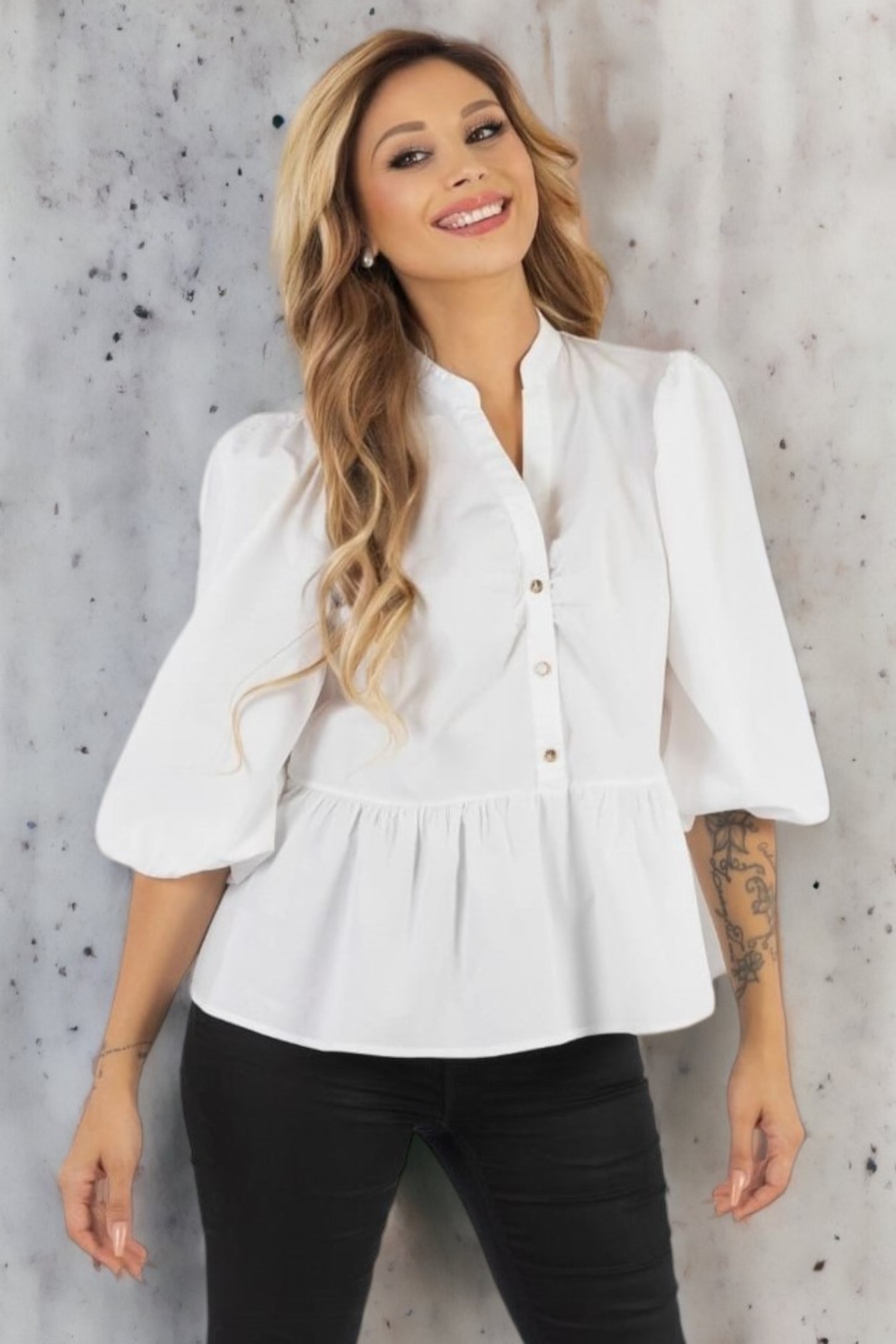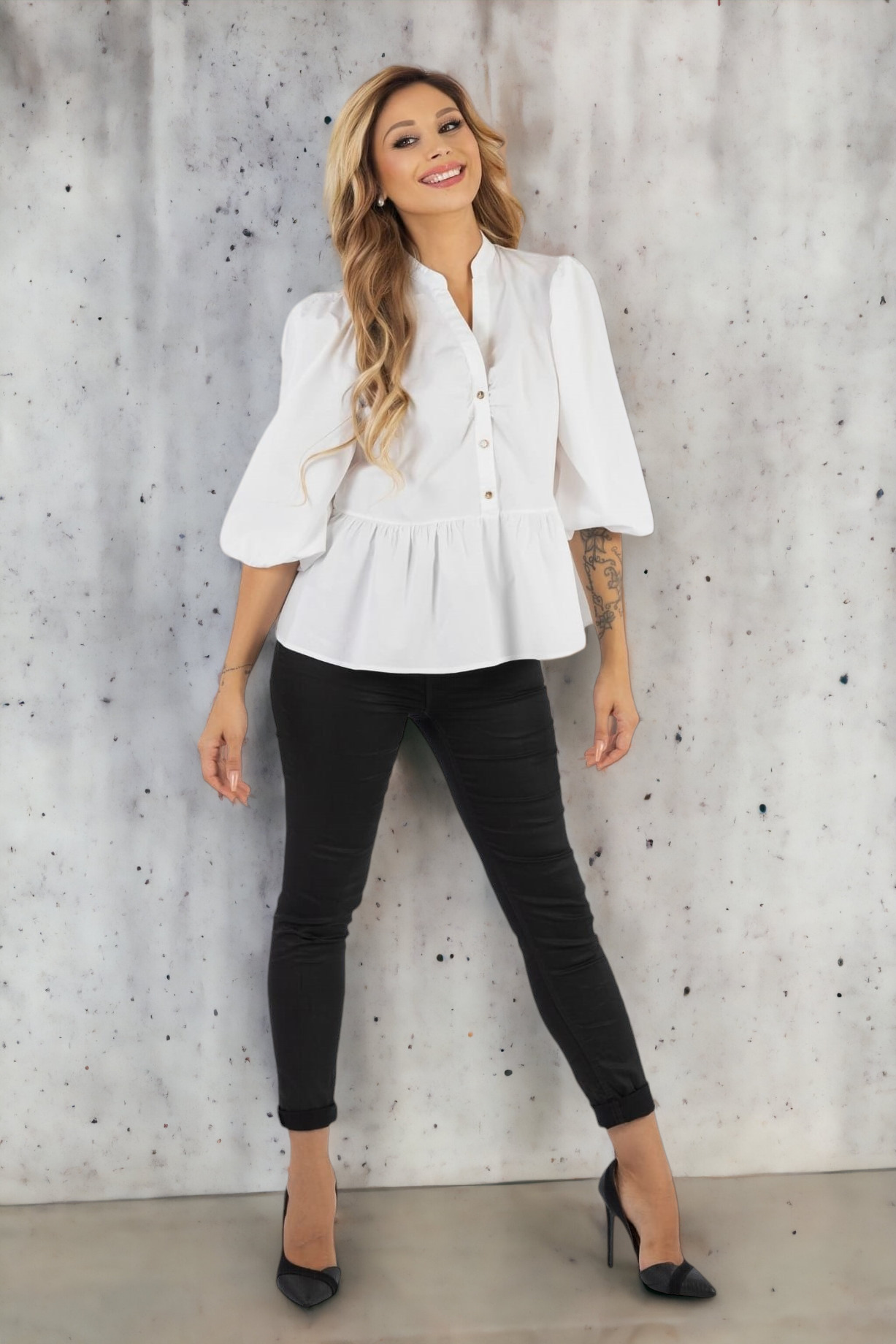 - Blusa blanca con manga abullonada por debajo del codo con terminaciones elásticas y detalle de botones, fresca, versátil y muy femenina.