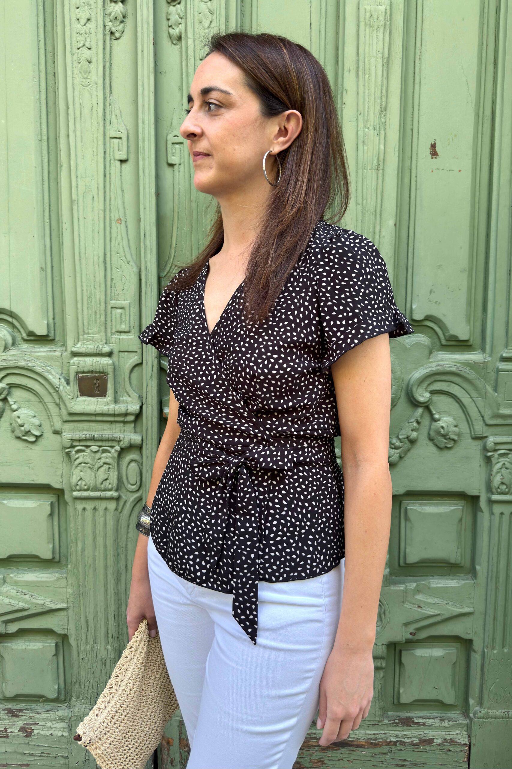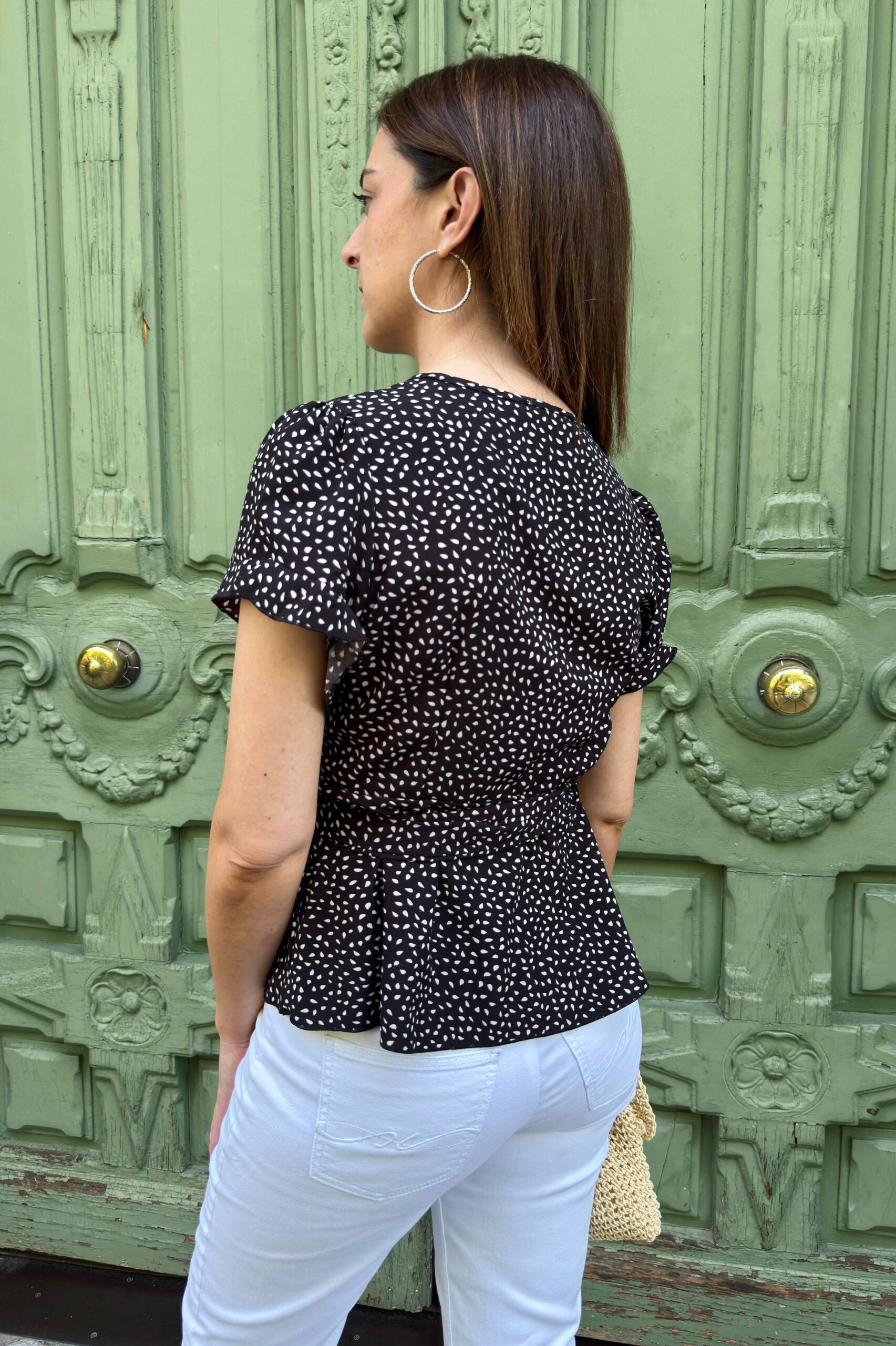 - Blusa cruzada negra con pequeños topos blancos y lazo lateral que define la cintura, manga corta y escote cruzado en pico.