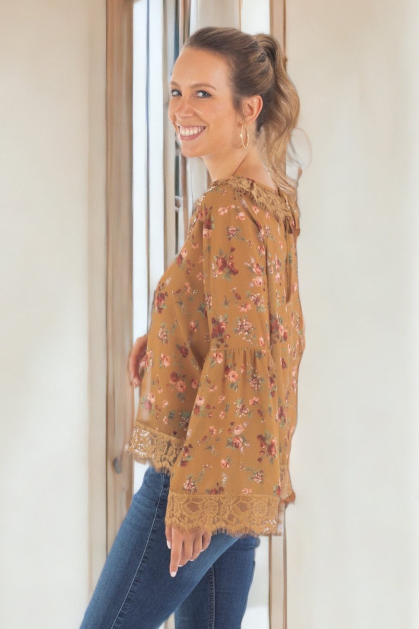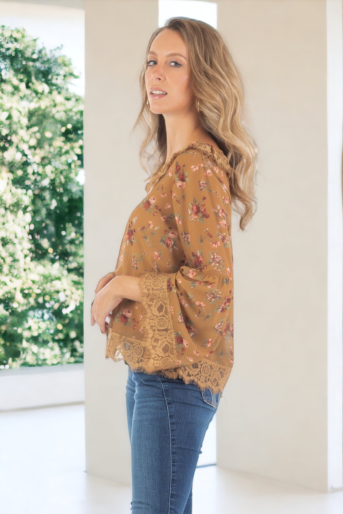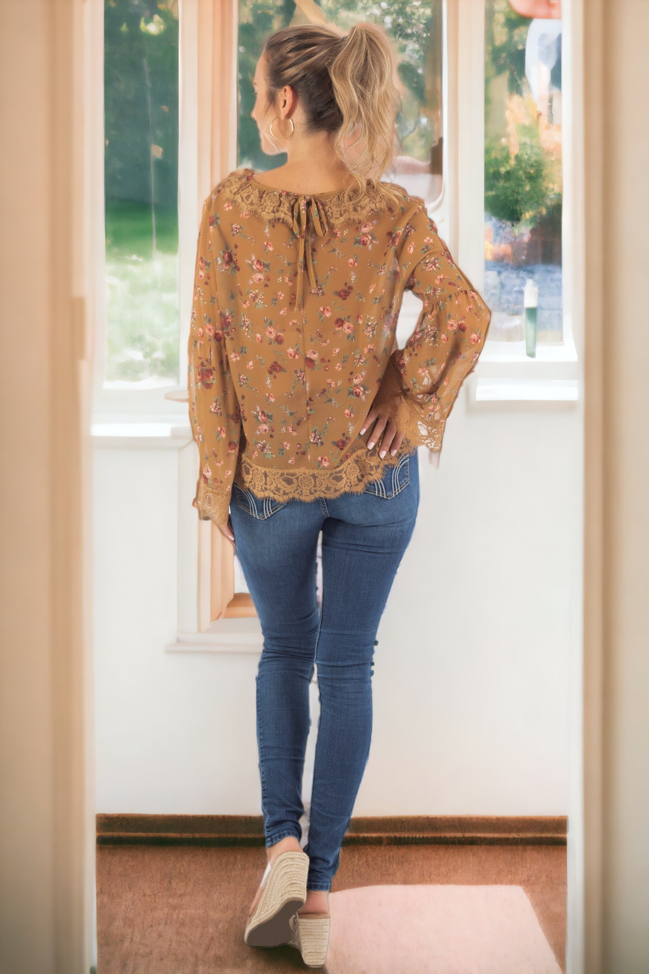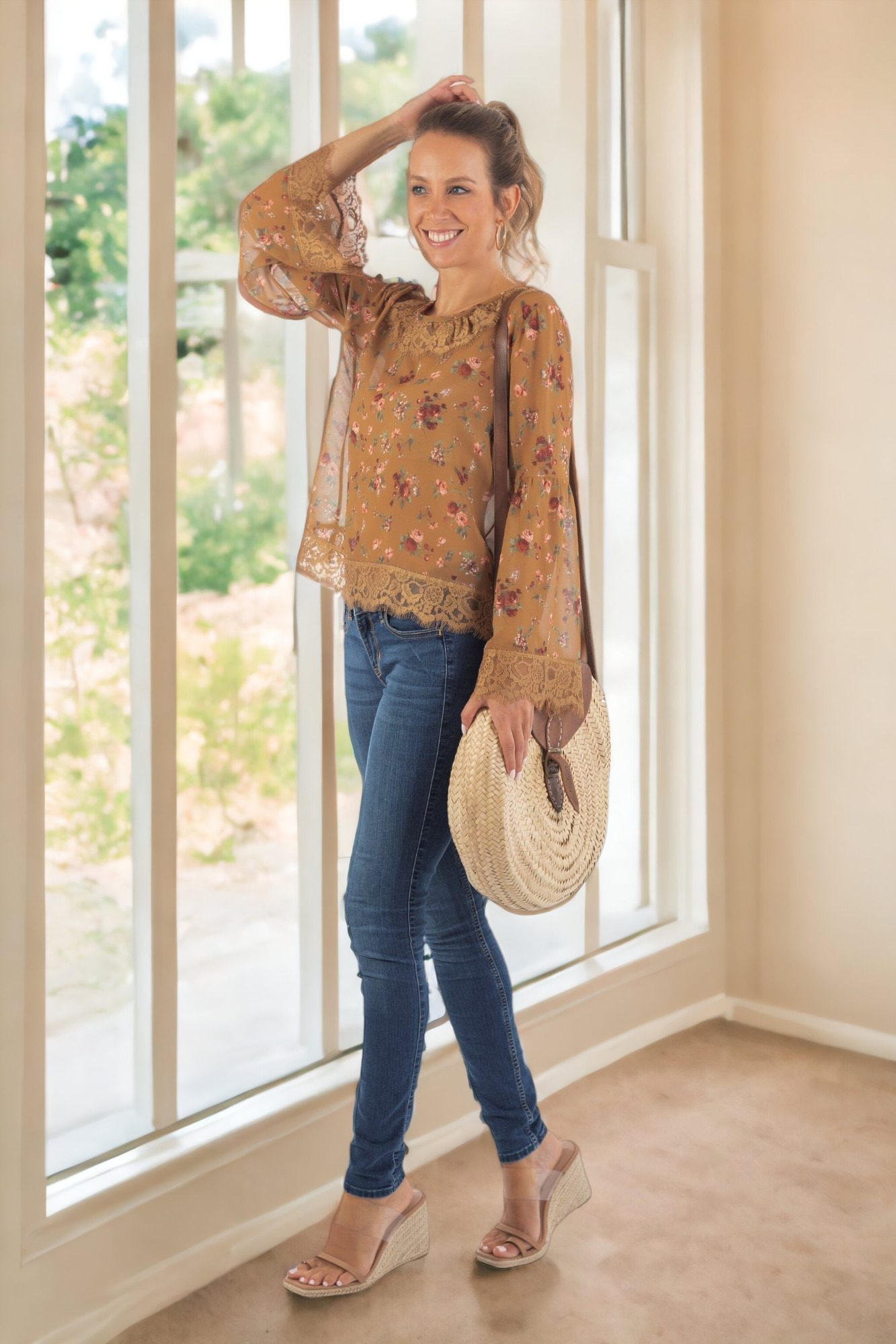 - Blusa mostaza semitransparente con estampado floral y detalles de encaje en cuello, mangas y bajo.