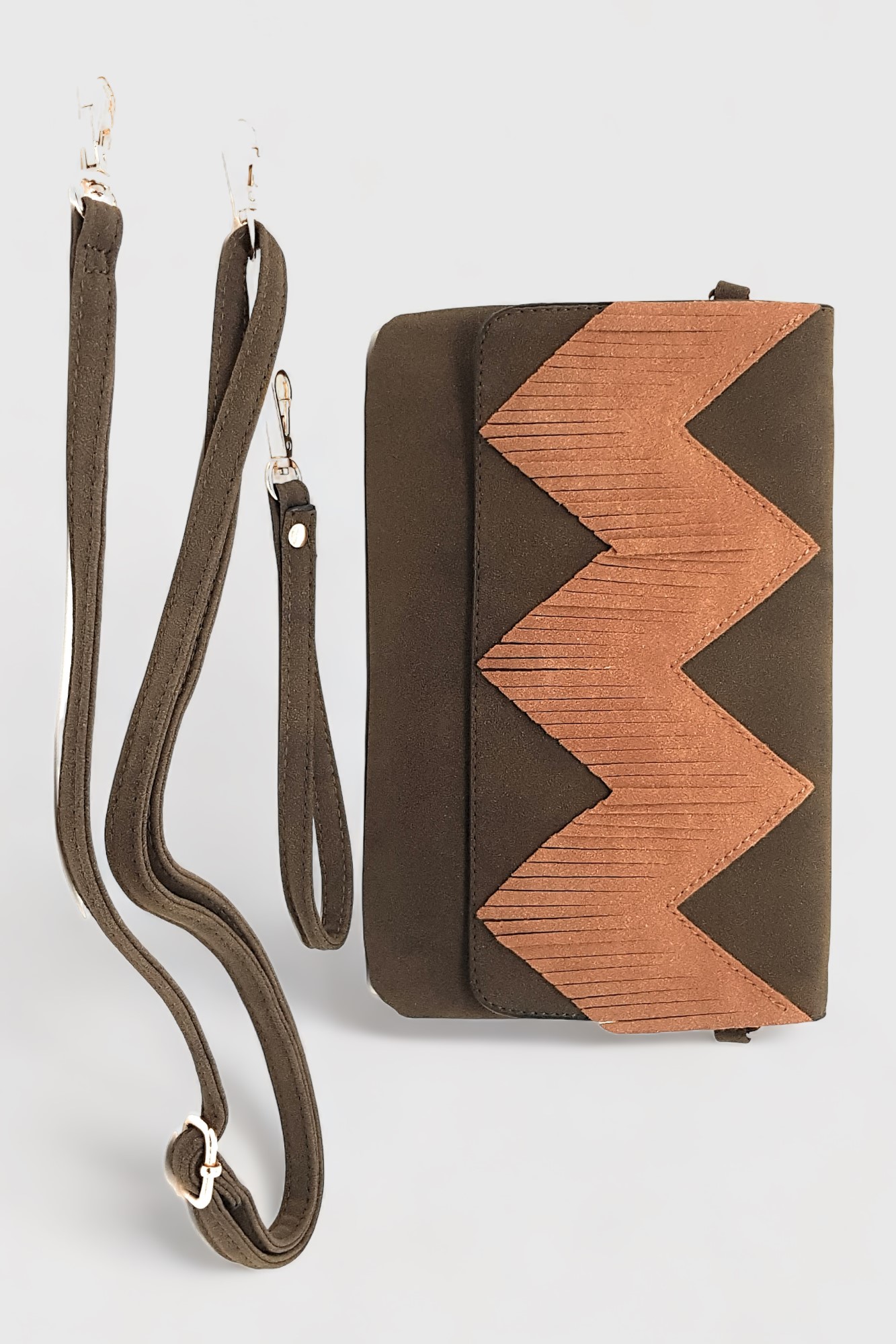 Bolso efecto ante verde combinado con flecos color camel, llévalo como bolso de mano o colgado al hombro.
