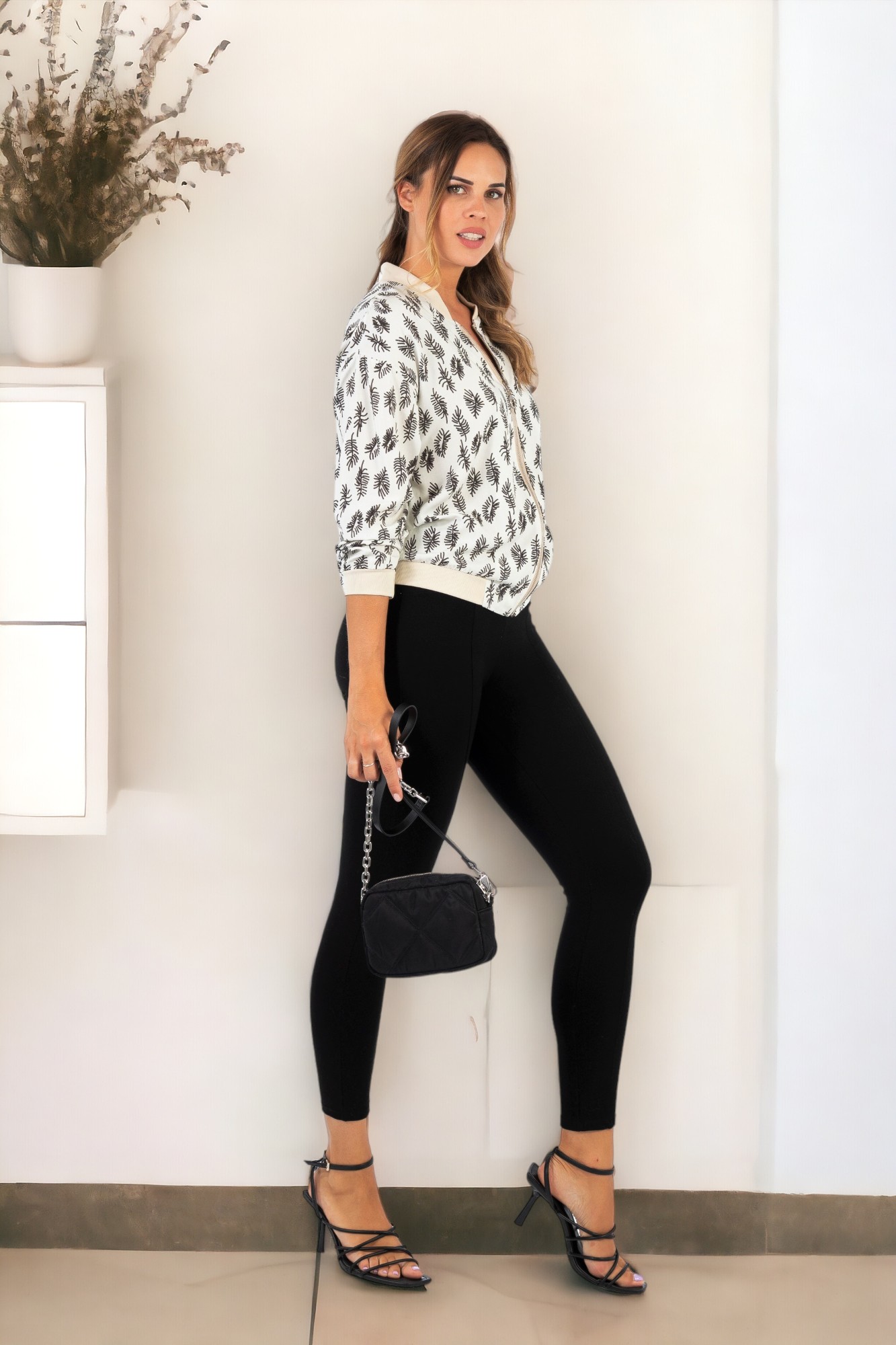- Esta bomber blanca con estampado negro es una prenda perfecta para quienes buscan un estilo actual y femenino con un toque distintivo.