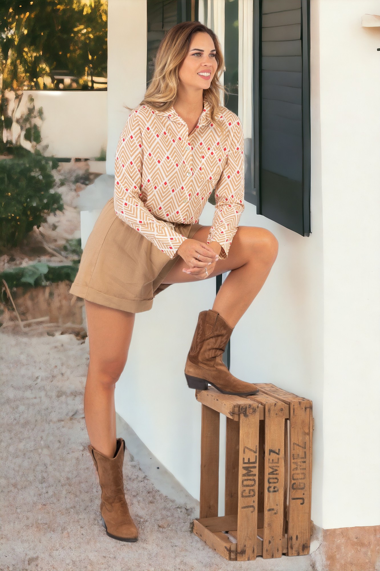 - Camisa beige de estampado geométrico con caída fluida y tacto suave.