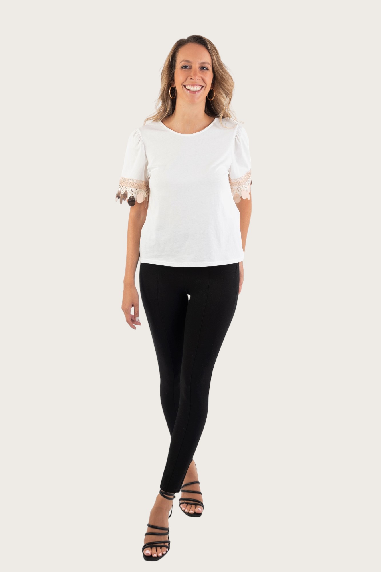Camiseta de manga corta con bordado y lentejuelas, ideal para añadir un toque de fiesta a tus looks