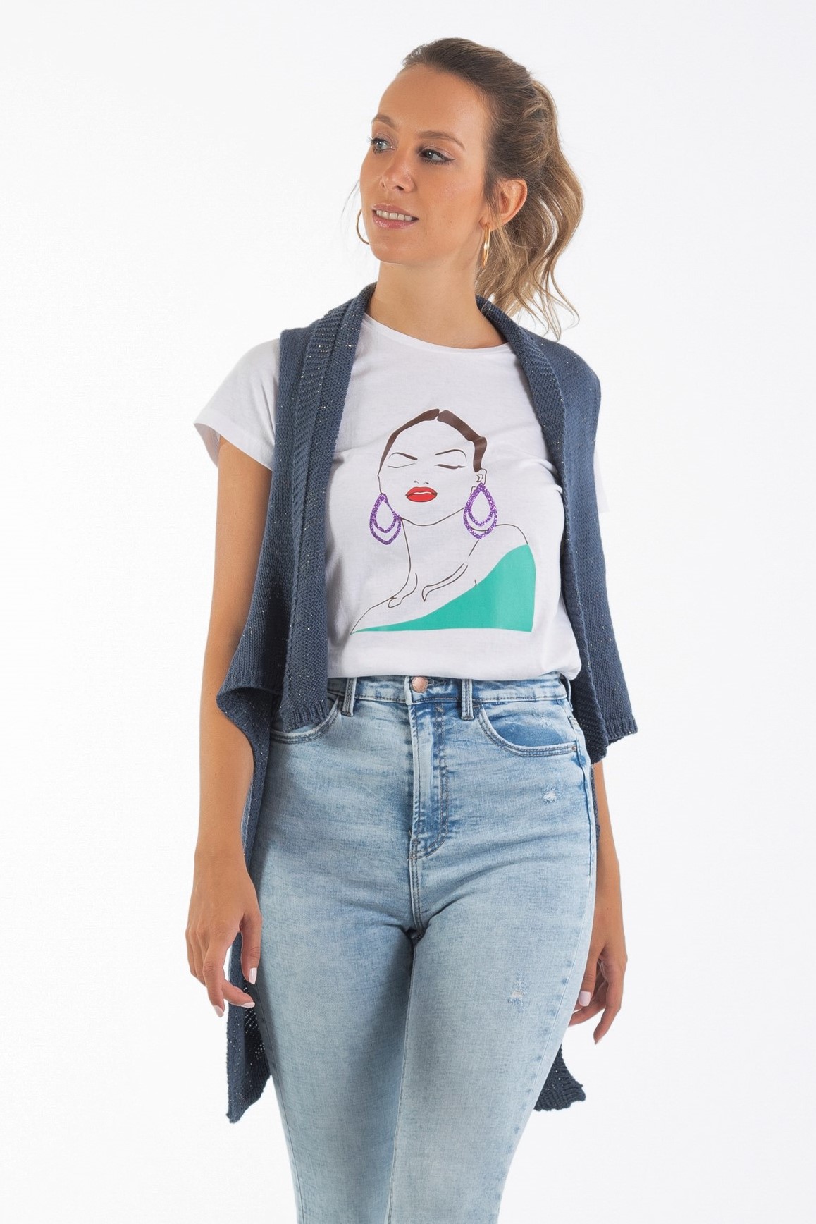 - Chaleco de punto azul ligero y cómodo, perfecto para combinar con tops, camisas o básicos.