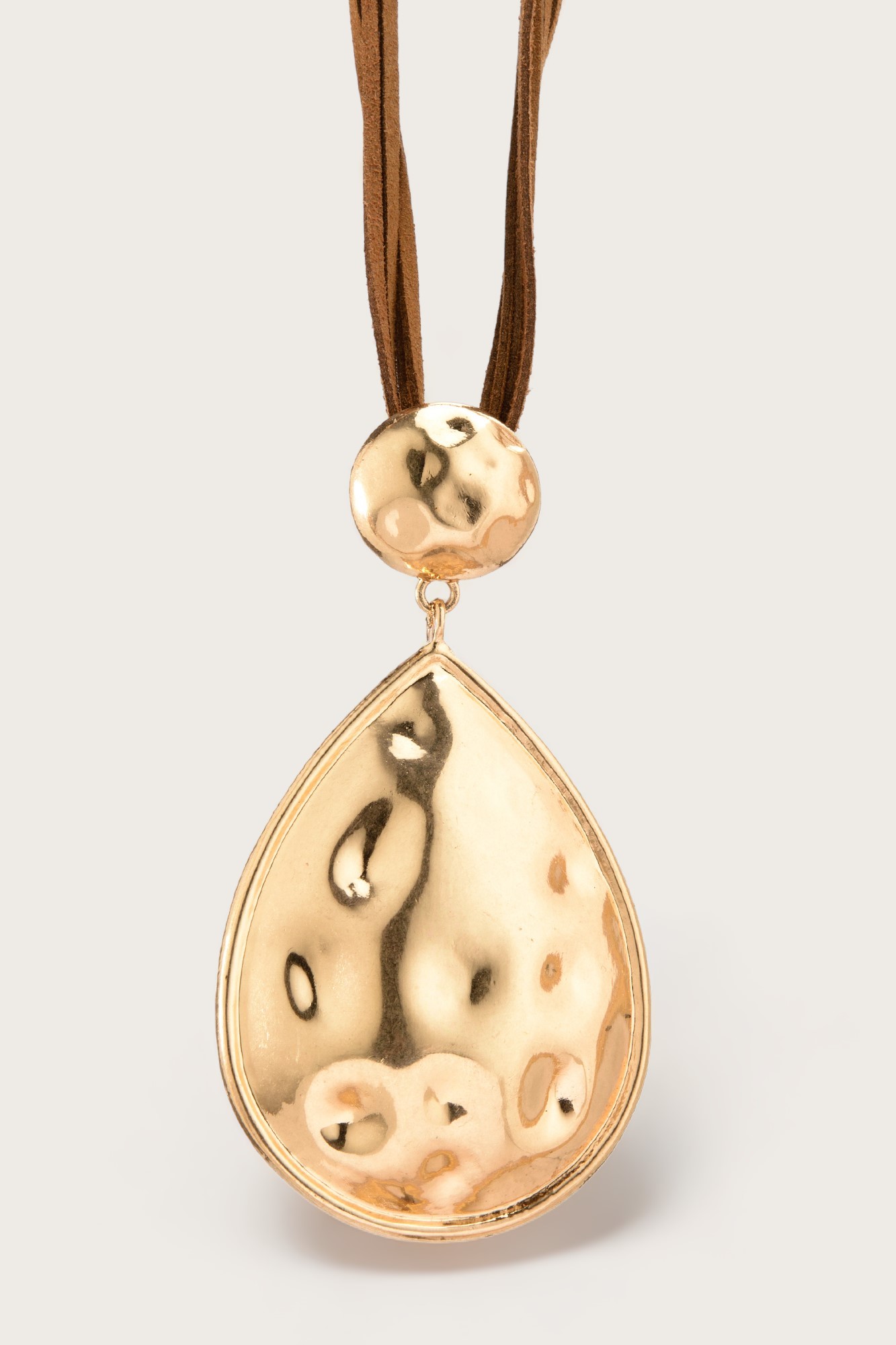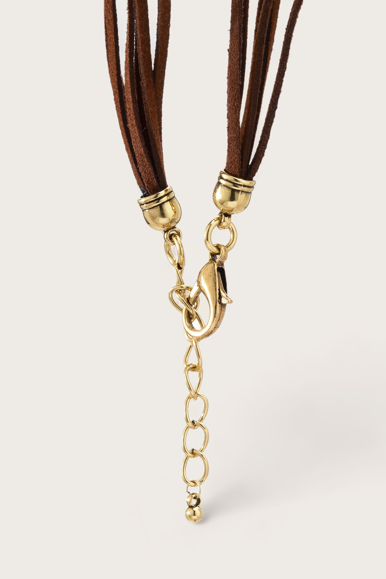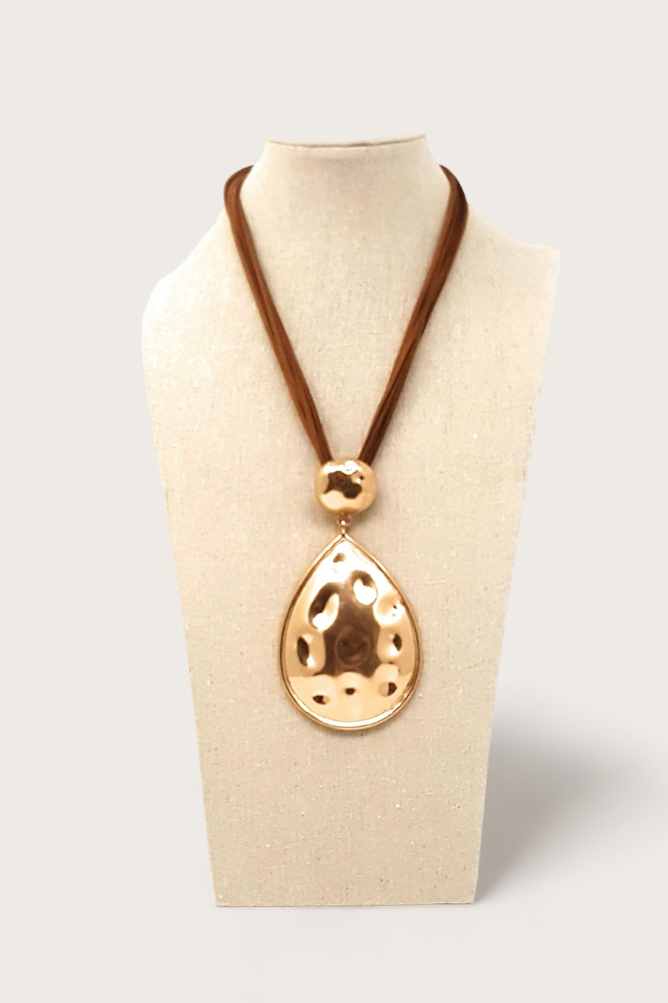 - Collar dorado con colgante en forma de lágrima y cordones en marrón. Una pieza llamativa y elegante que transforma cualquier look con un toque sofisticado y muy actual.
