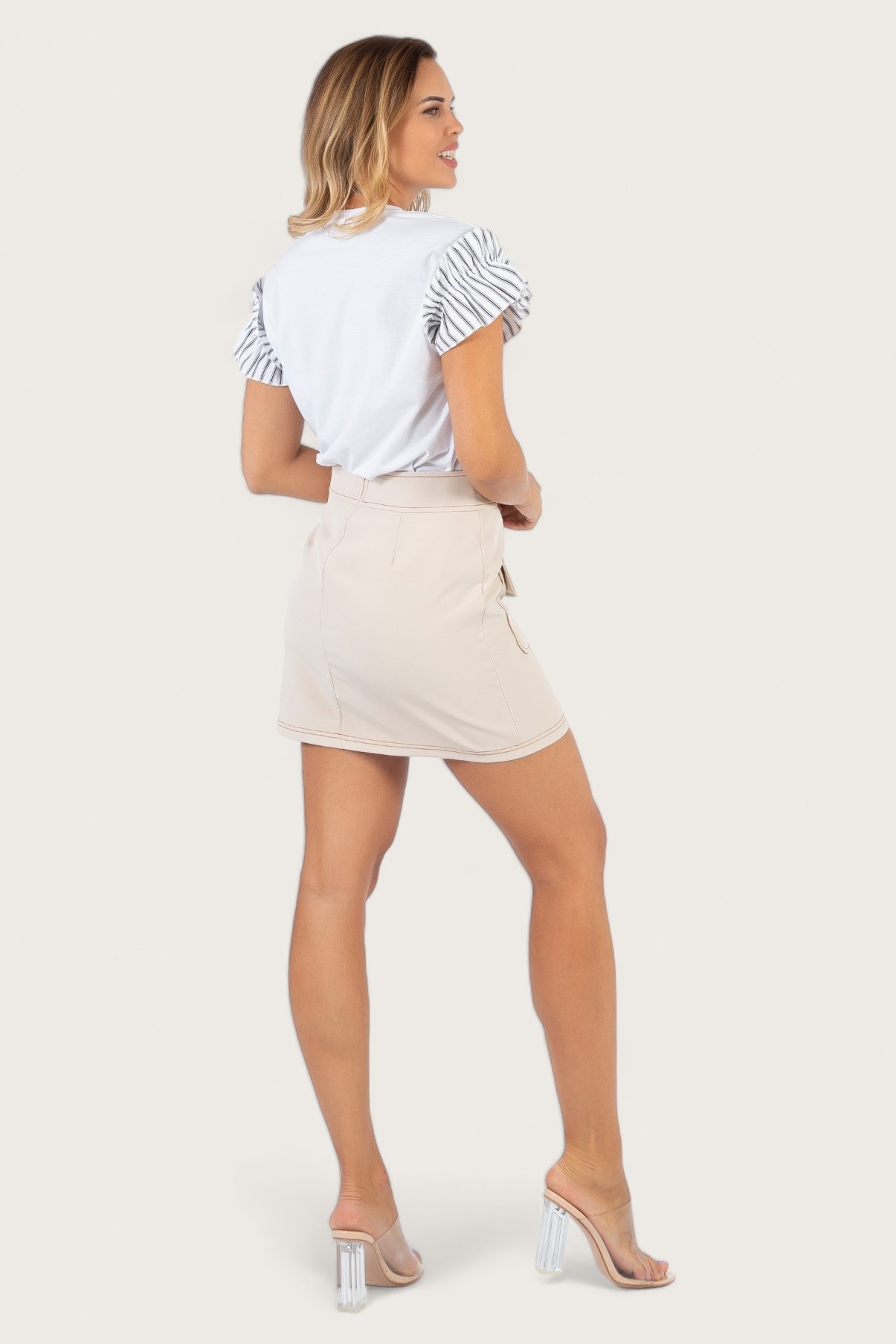 - Falda beige corta con diseño estructurado, bolsillos frontales de tapa y cinturón con hebilla efecto carey.
