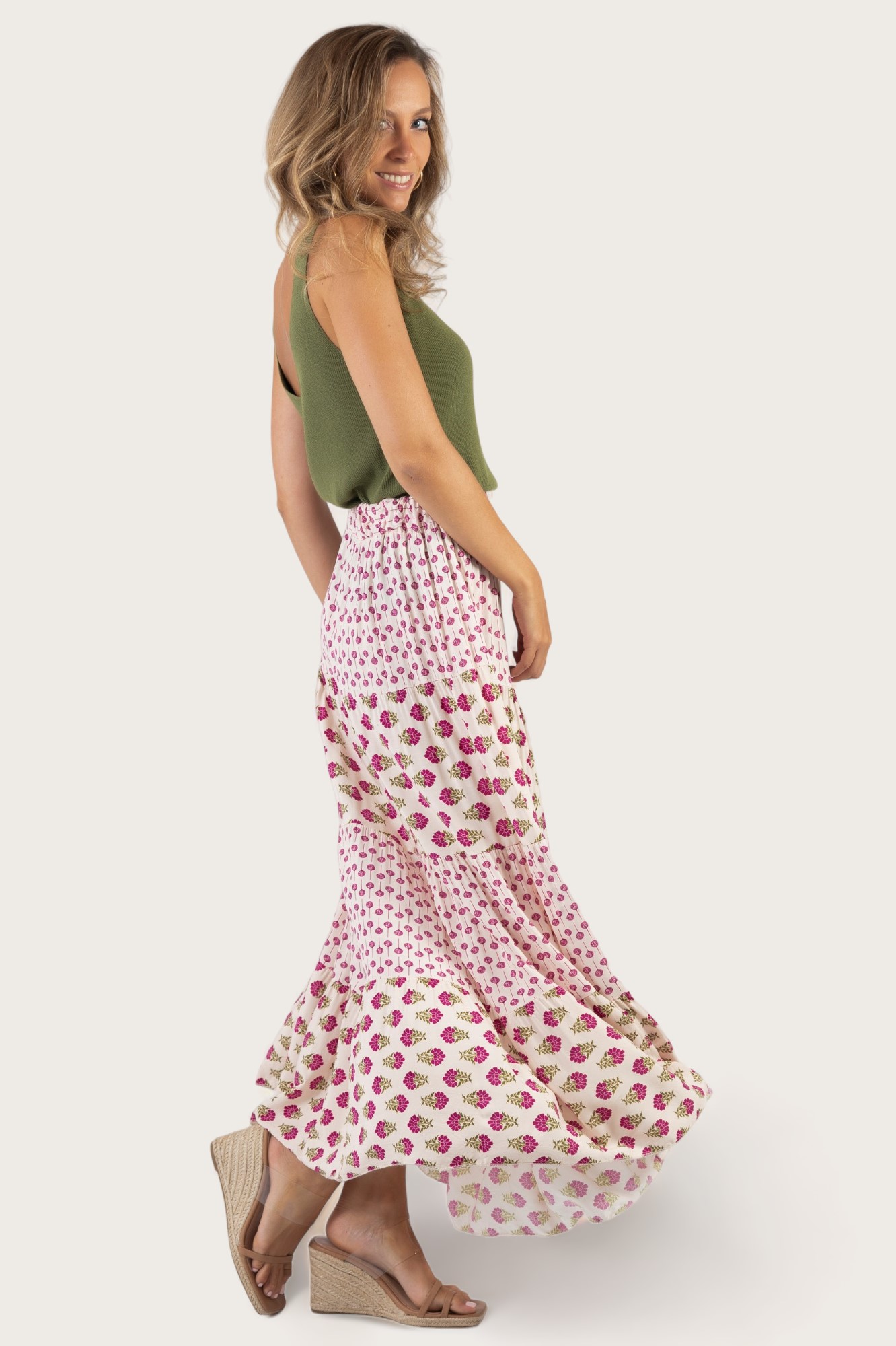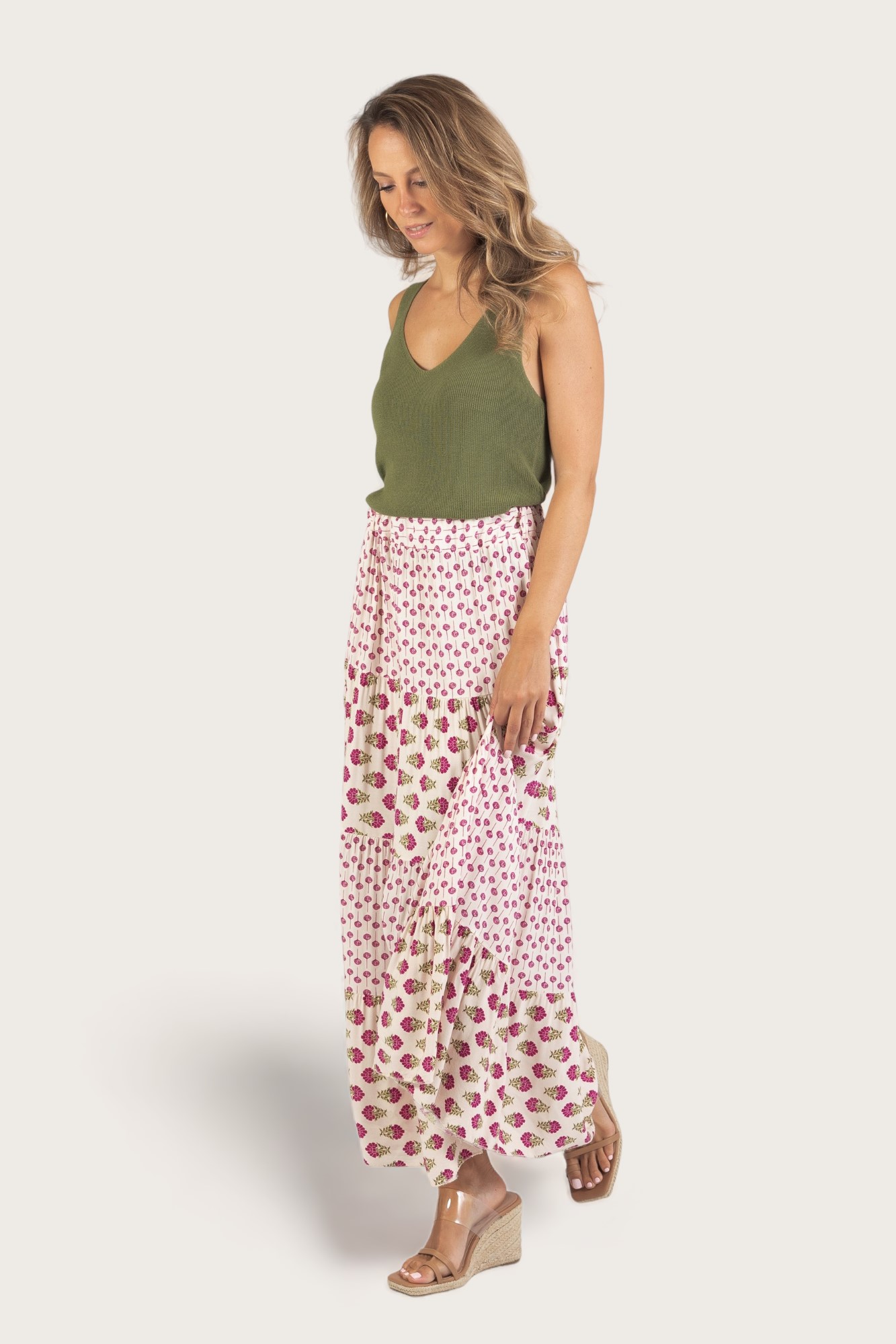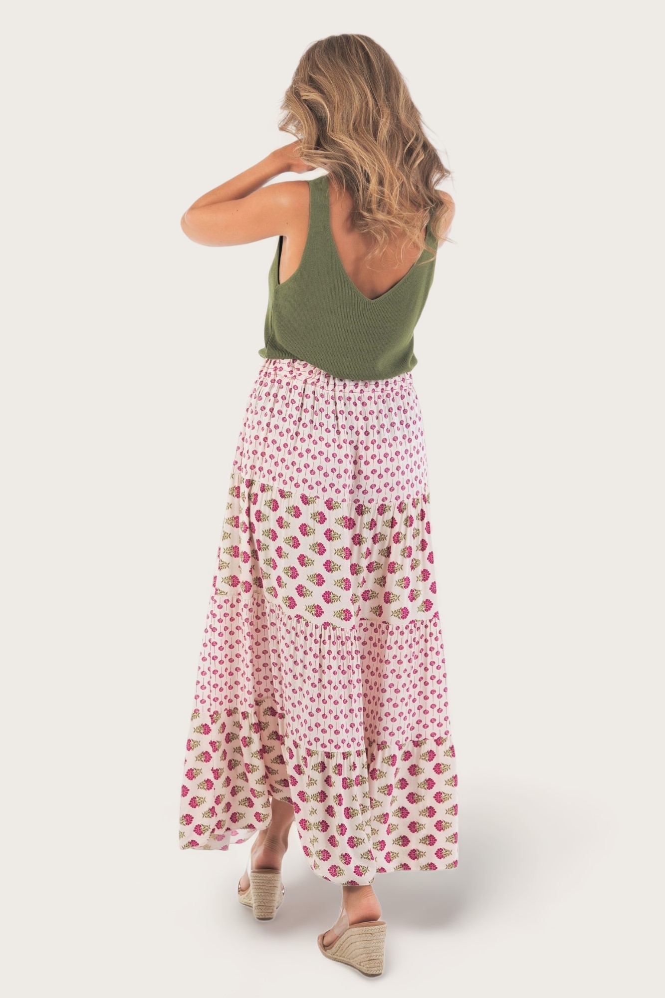 - Falda larga con estampado floral y cintura elástica.
