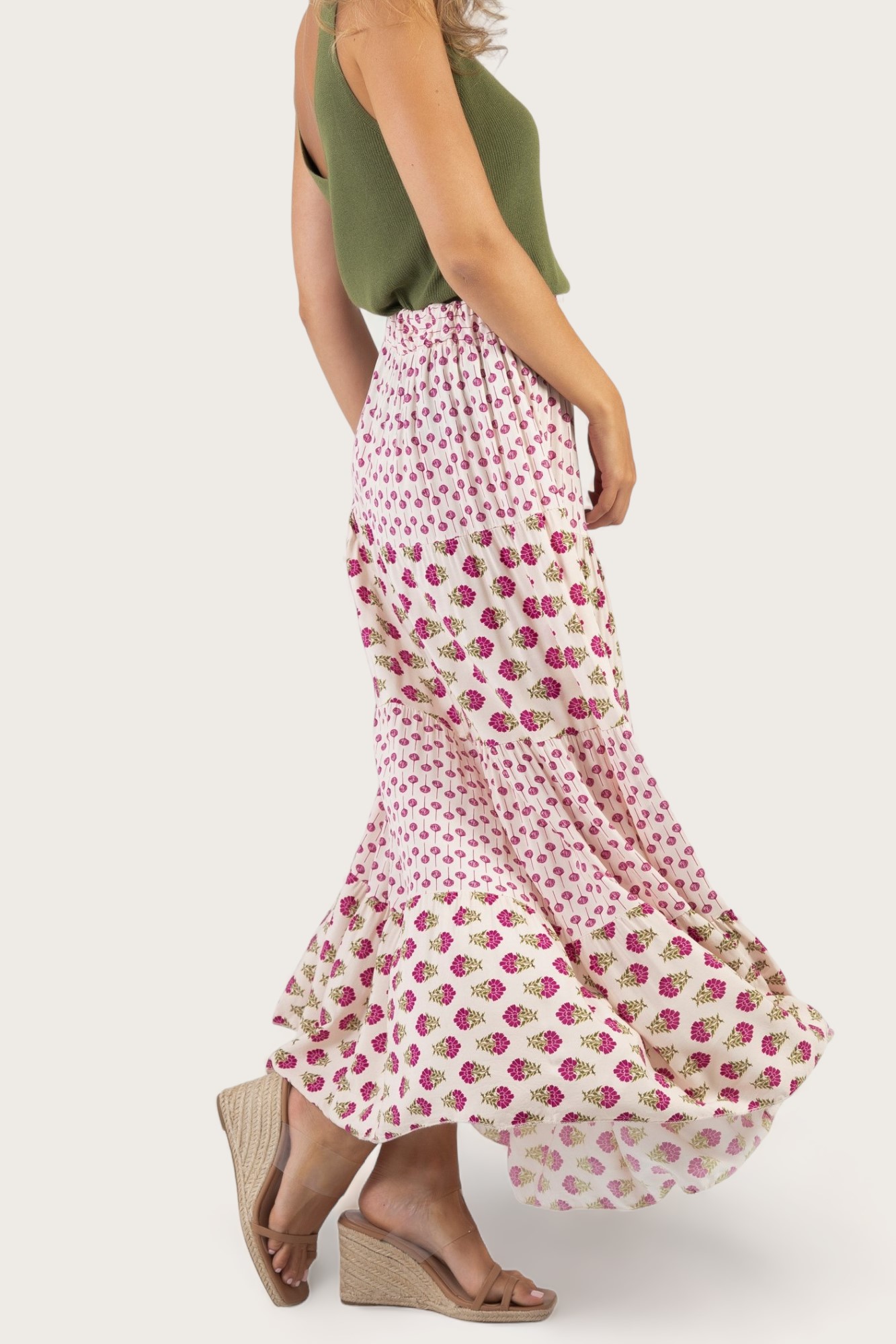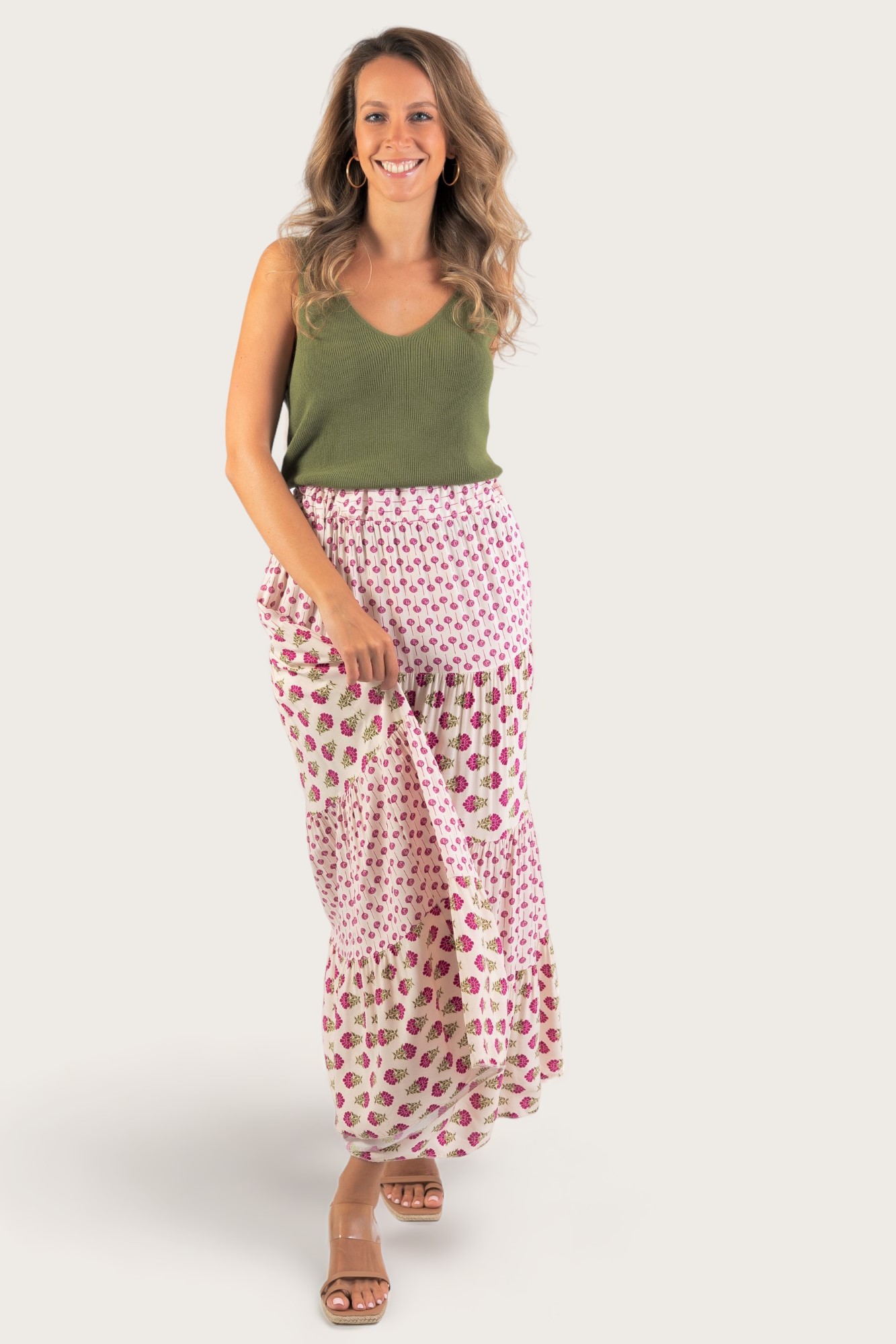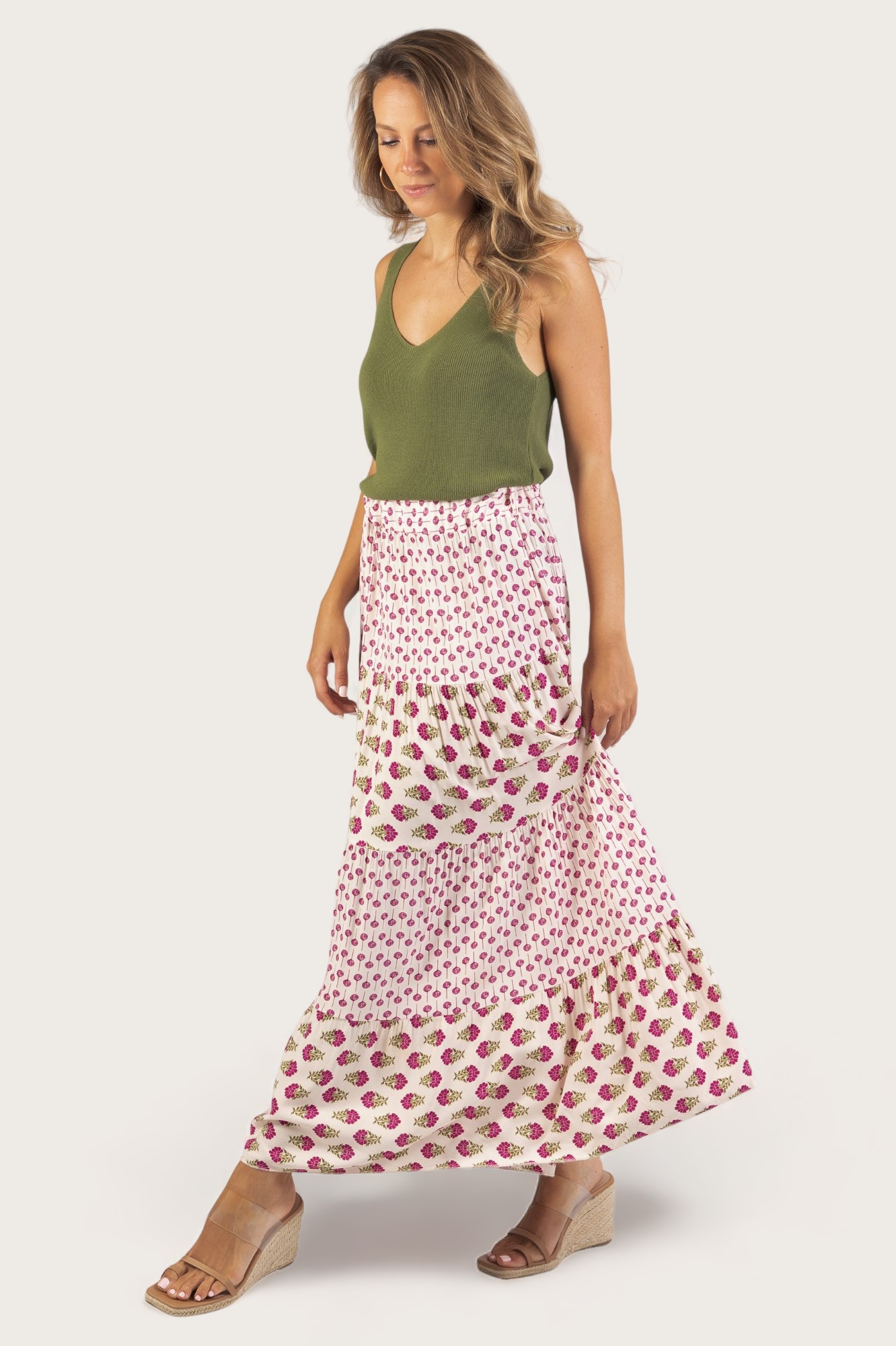 - Falda larga con estampado floral y cintura elástica.