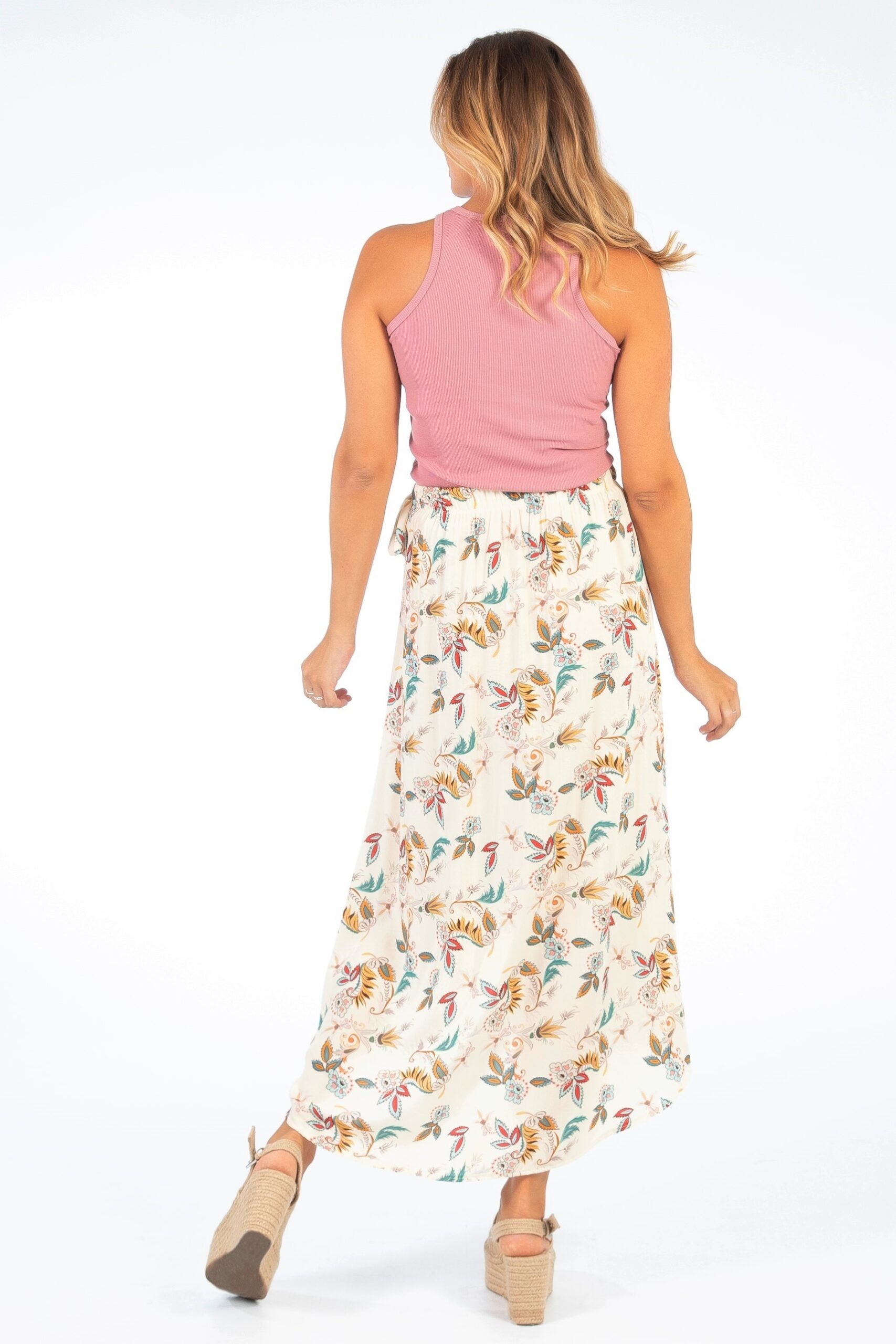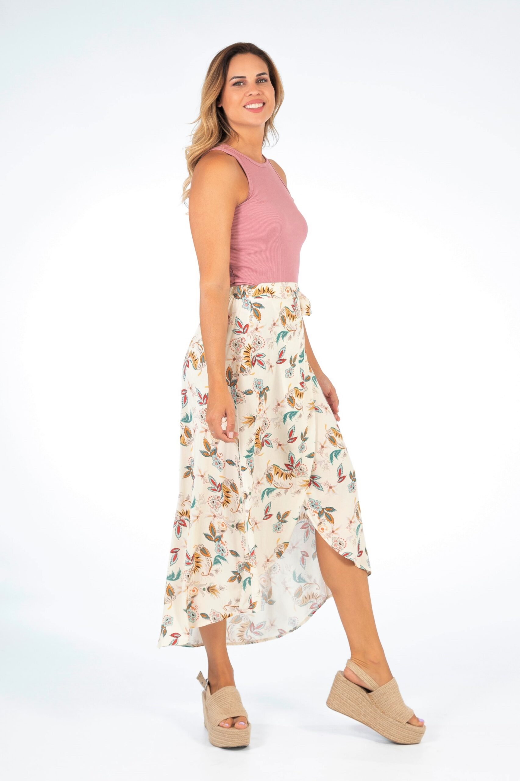 - Falda midi cruzada, con adorno de lazada en cintura del mismo tejido.