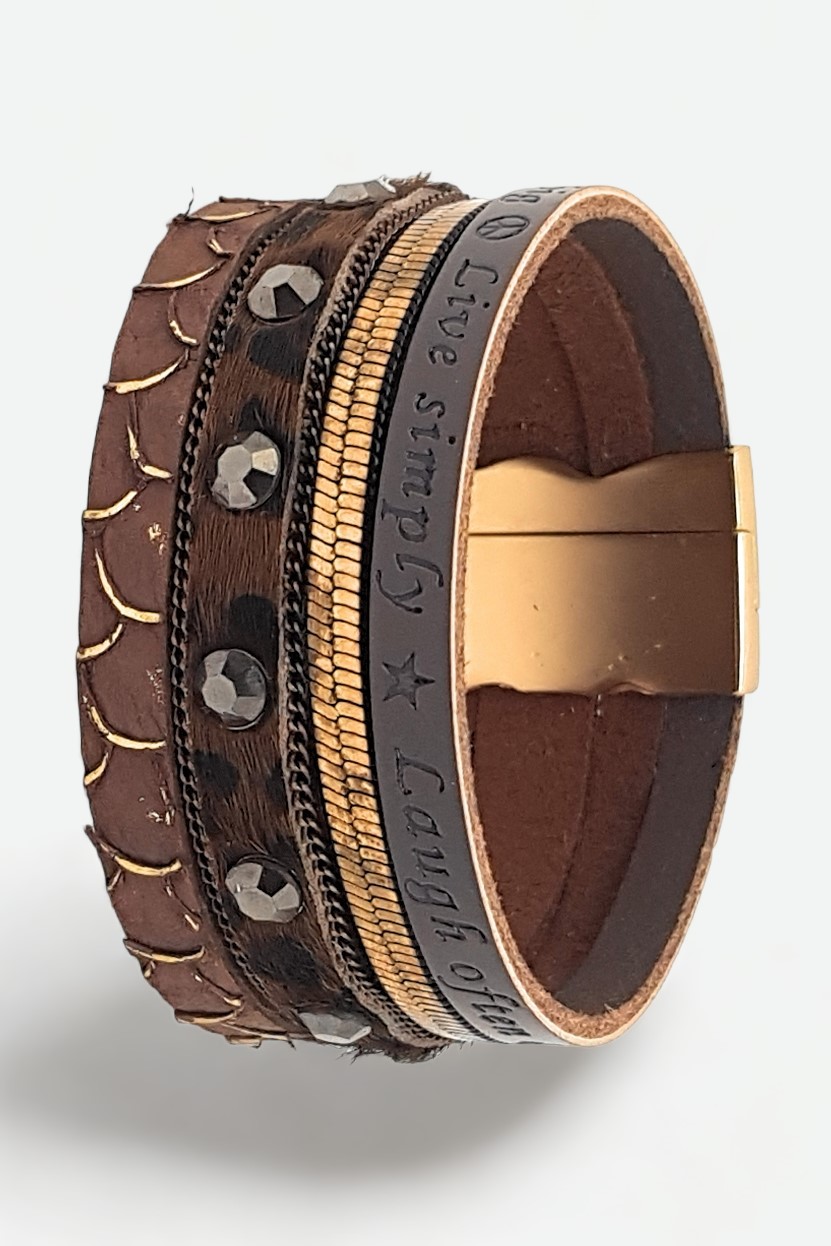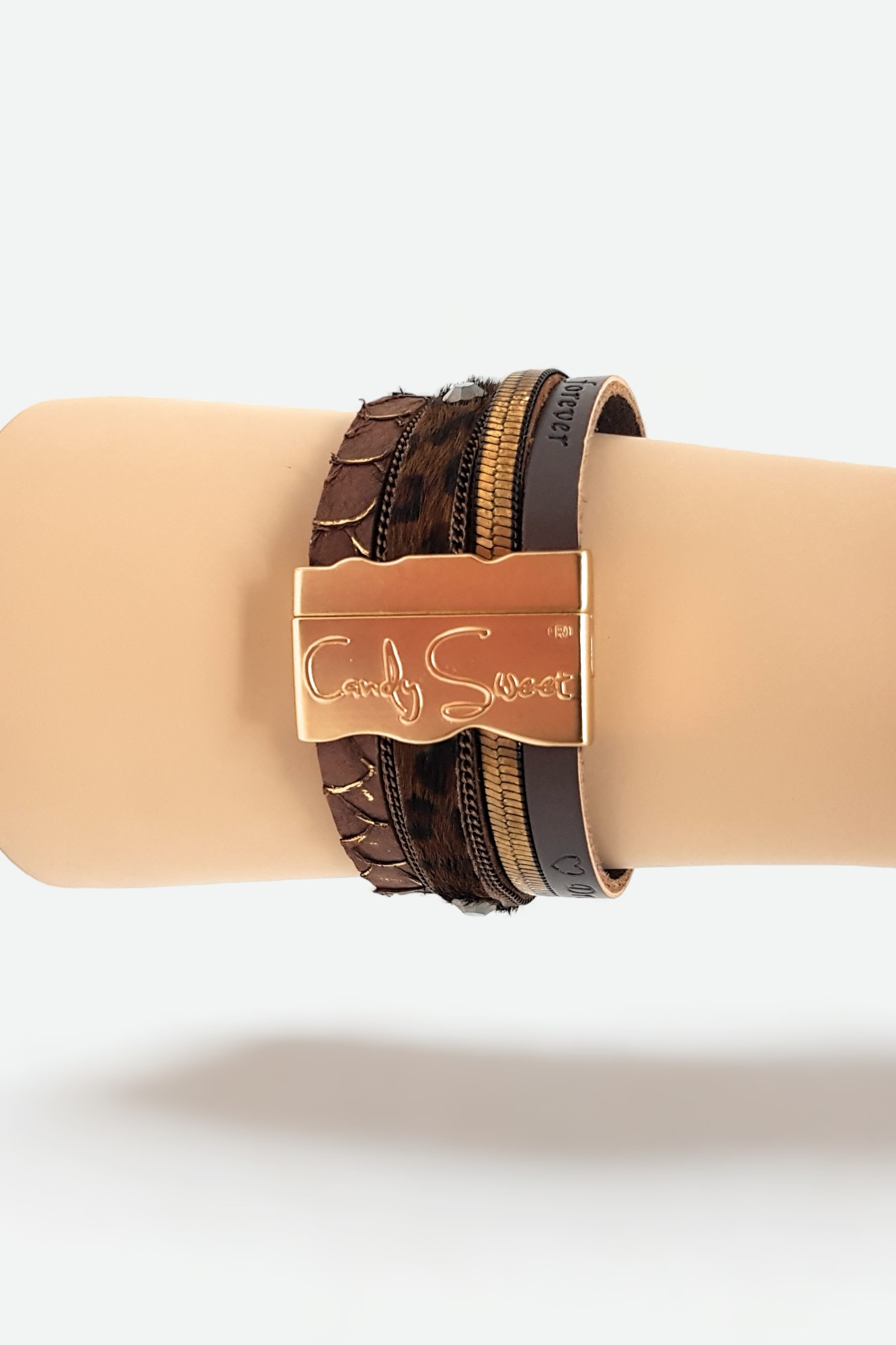 - Pulsera de cuero marrón con cierre imán dorado y mezcla de texturas, aplicaciones metálicas y detalles decorativos.