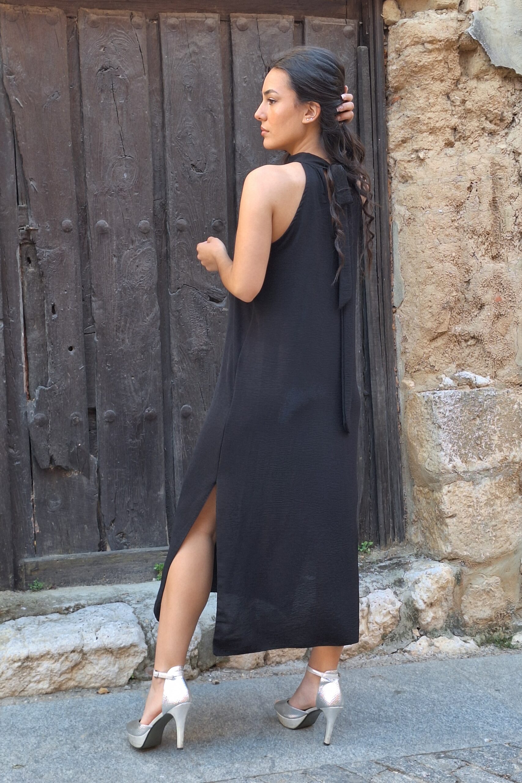 - Vestido largo negro con escote halter anudado al cuello y aberturas laterales.